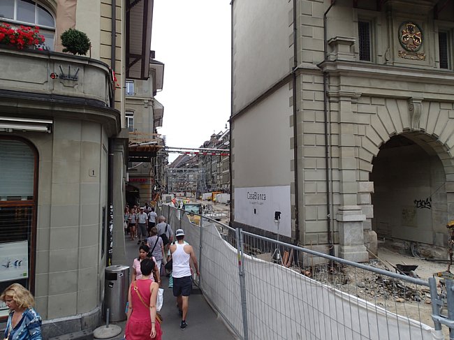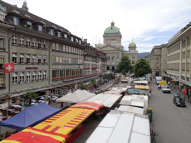 工事中のマルクト通りからベーレン広場の朝市とスイス連邦議会議事堂
