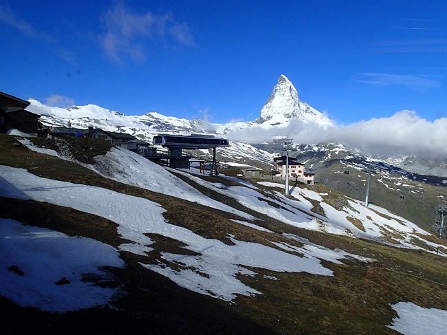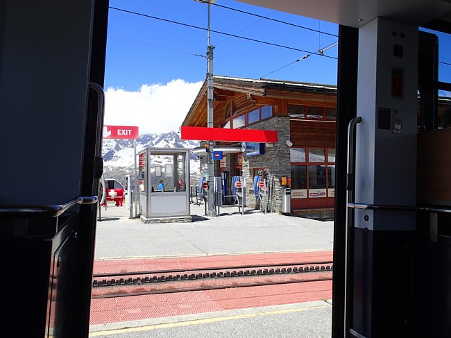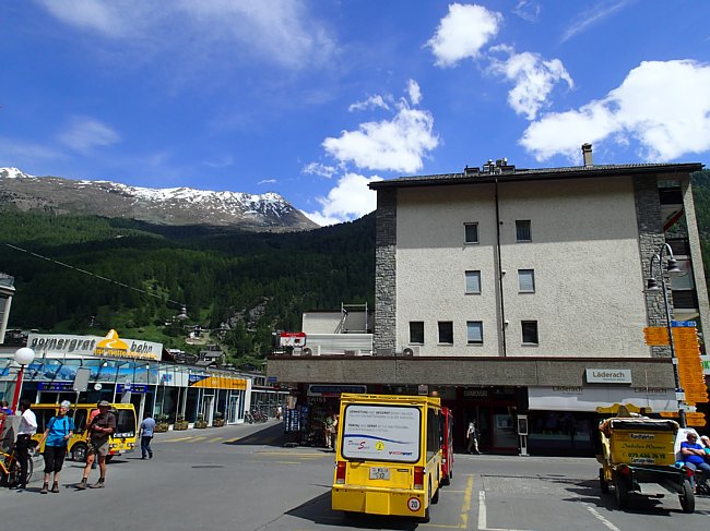 正面にCOOPのスーパー、左にゴルナー鉄道の駅、頭上にロートホルン