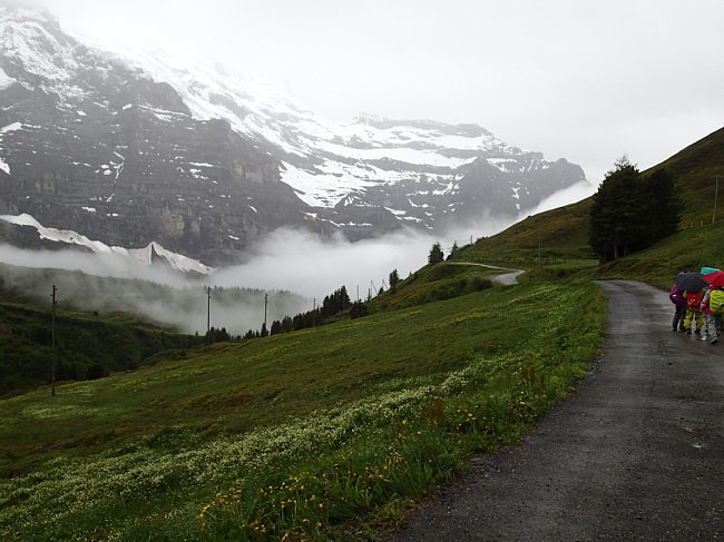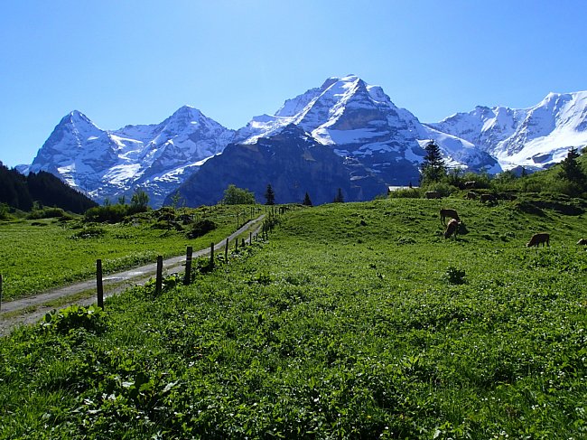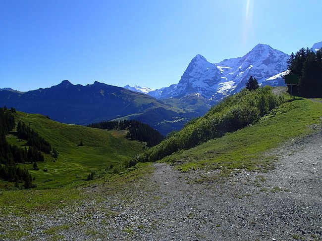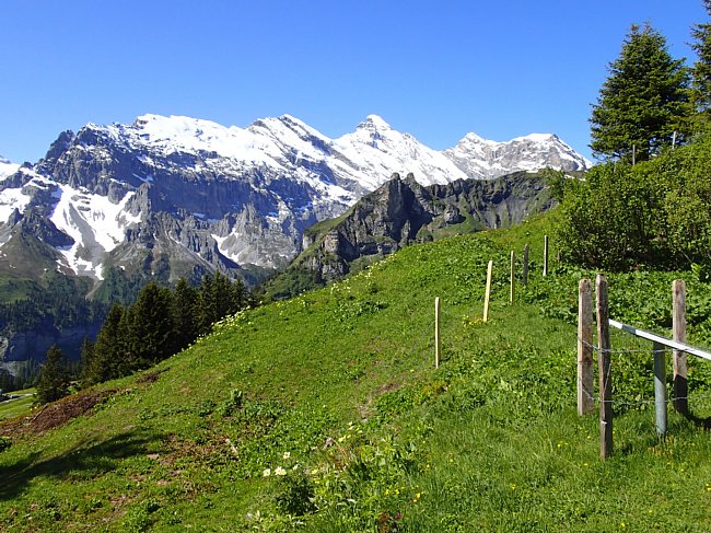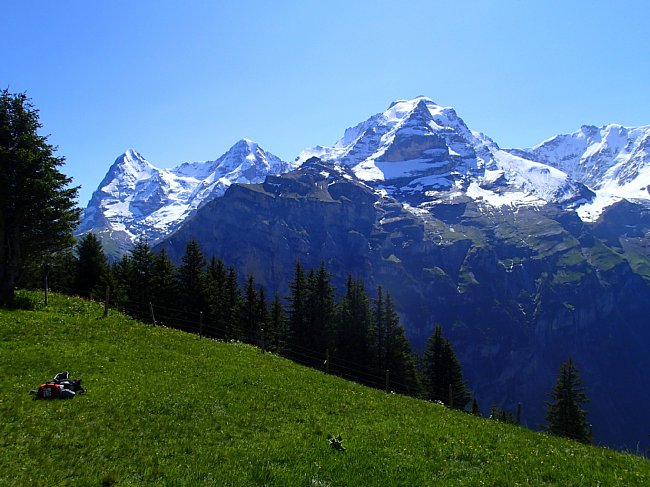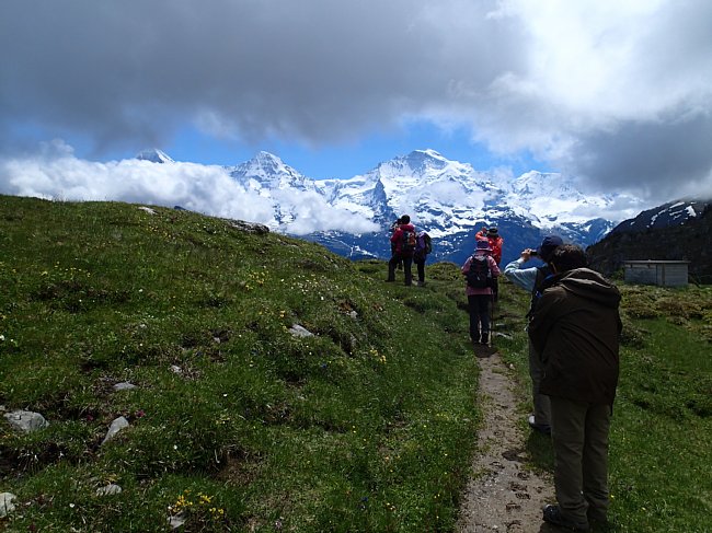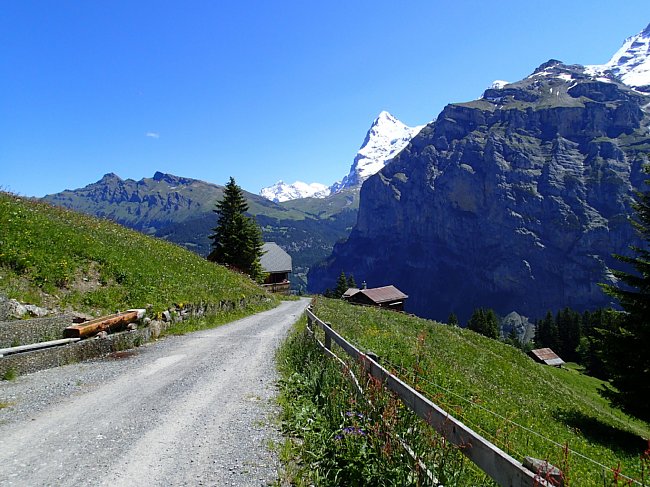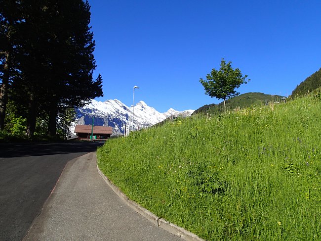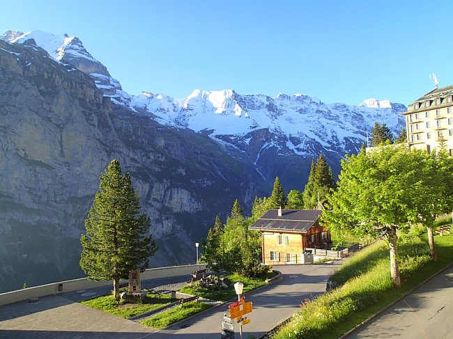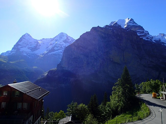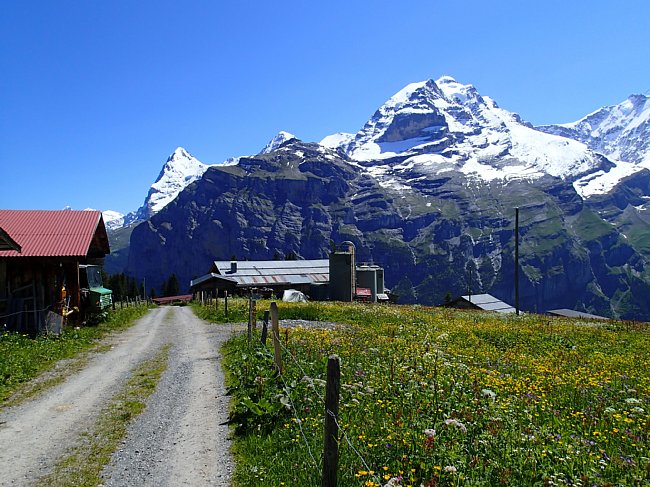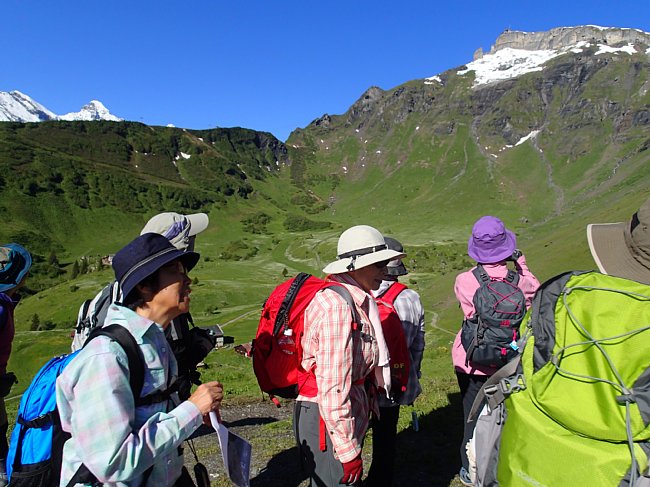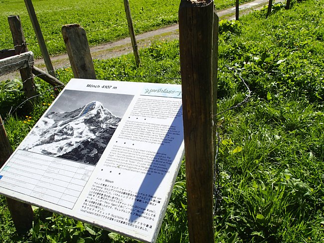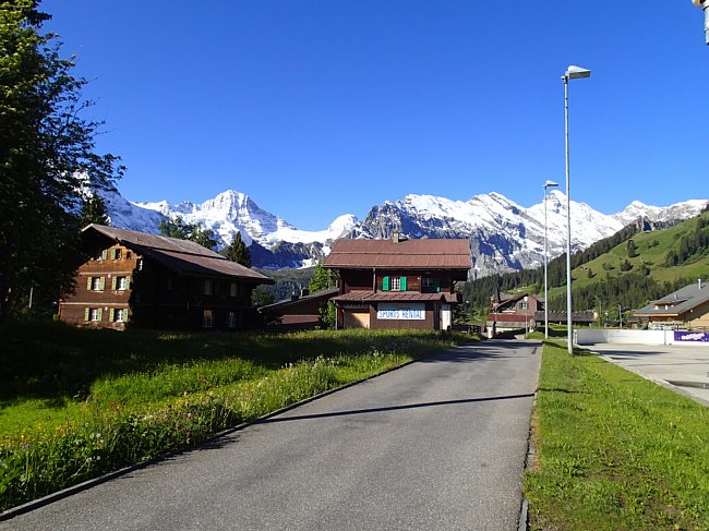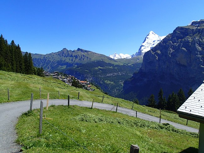 ベルナーオーバーラント三山を左にアルメントフーベルケーブル駅へ向かう