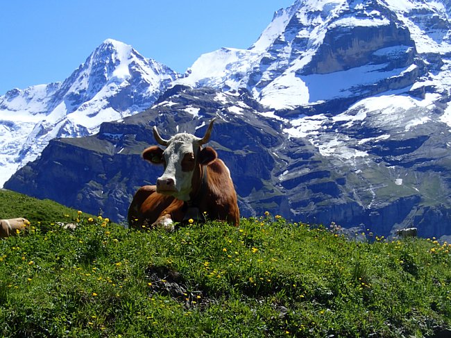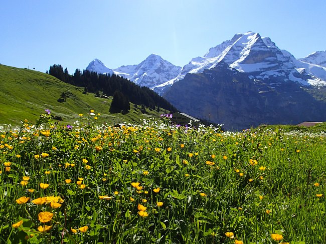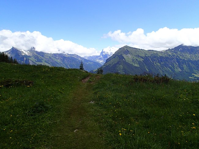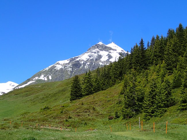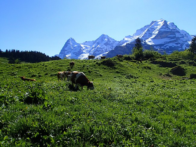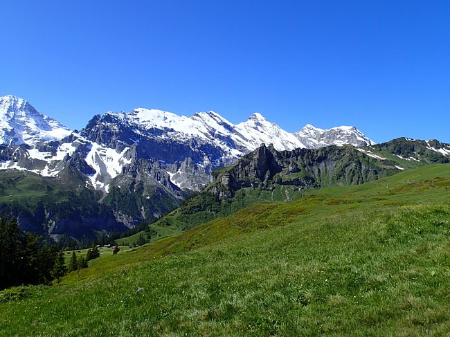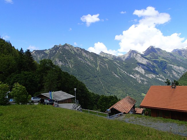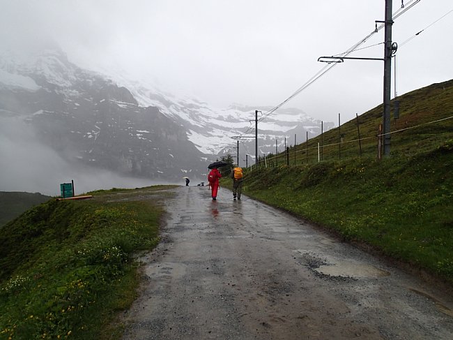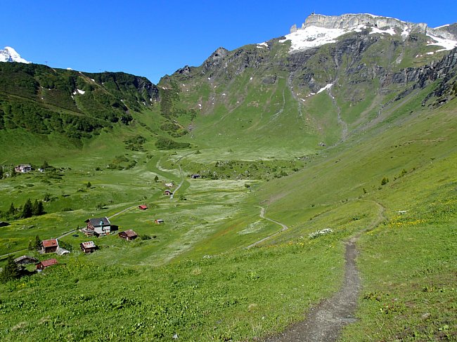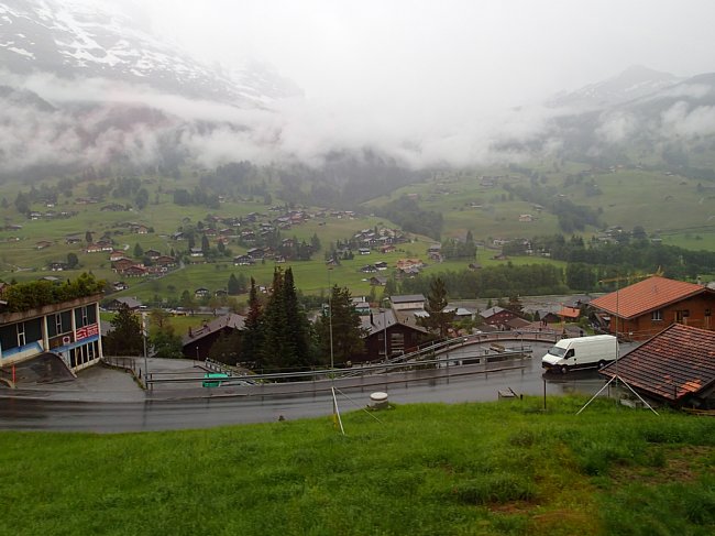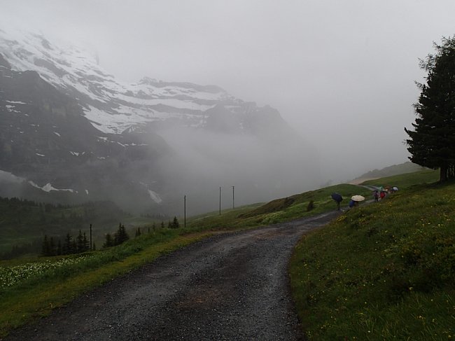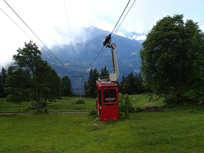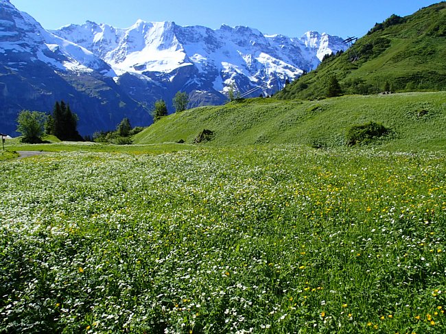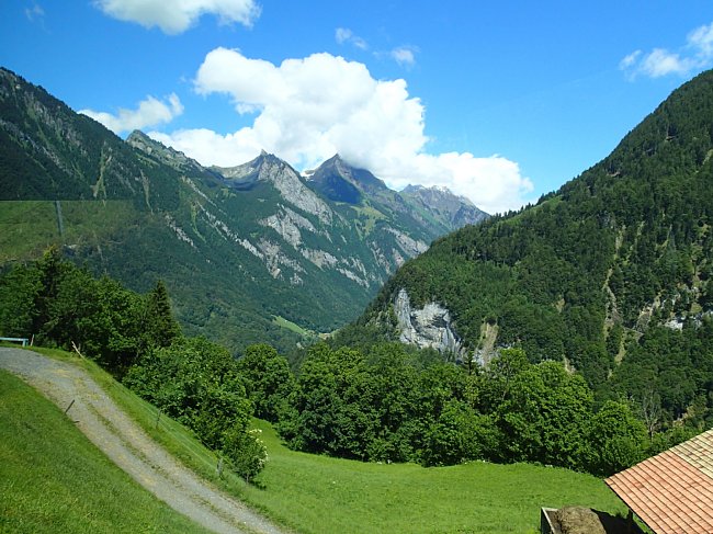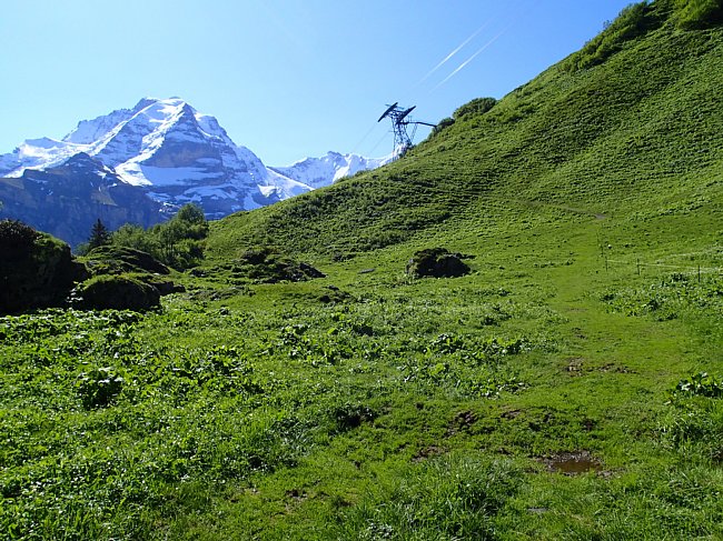 ベルナーオーバーラント三山を左にアルメントフーベルケーブル駅へ向かう