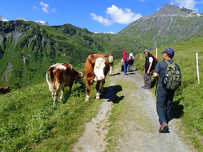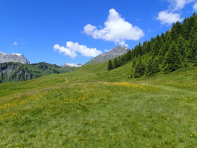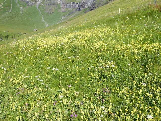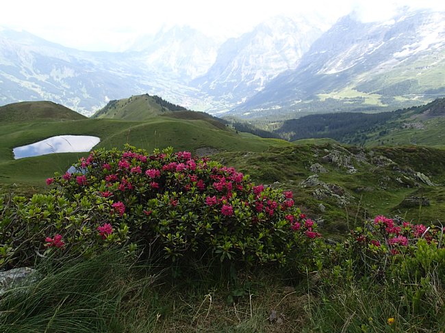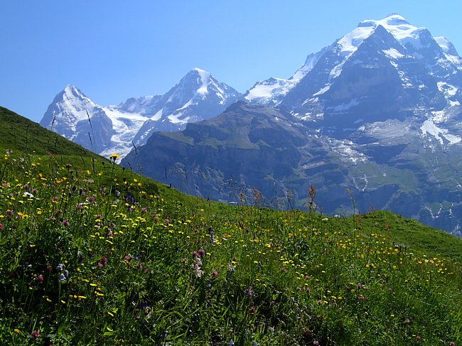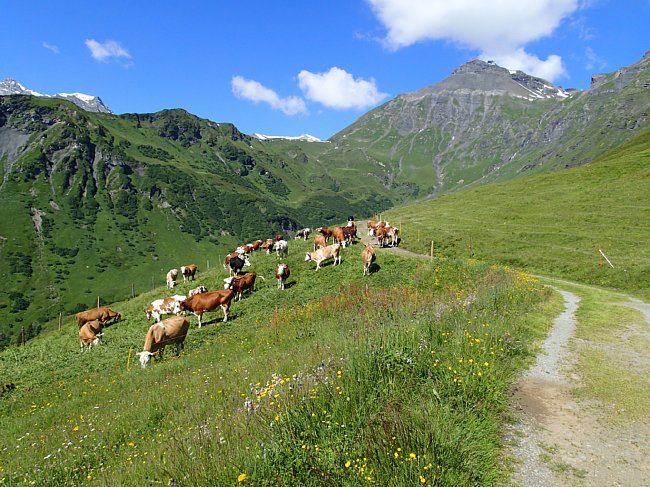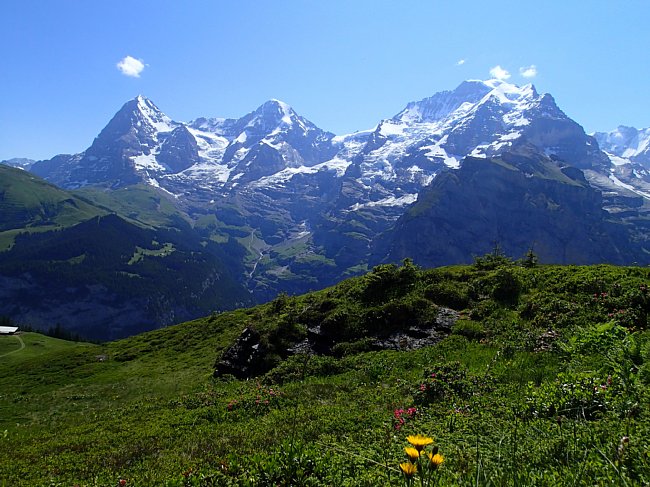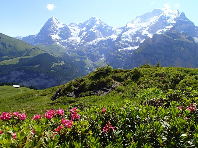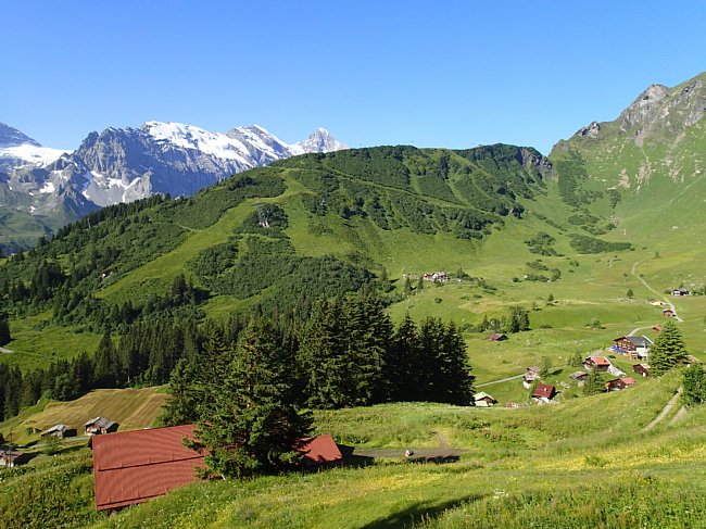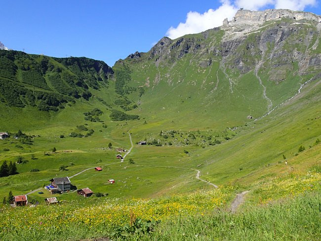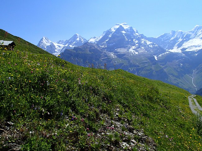 アルメントフーベルから花の谷を横切ってノースフェーストレールを歩き、シルトアルプのチーズ小屋を経由してミューレンへフラワーハイキング。午後3時にスーツケースをミューレン駅からチューリッヒ空港へ送るため午前中半日のハイキング。
