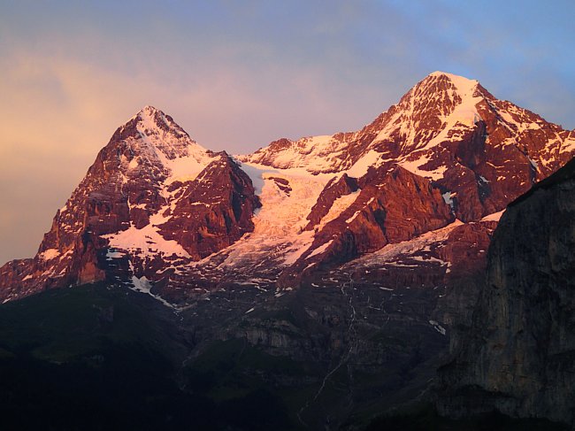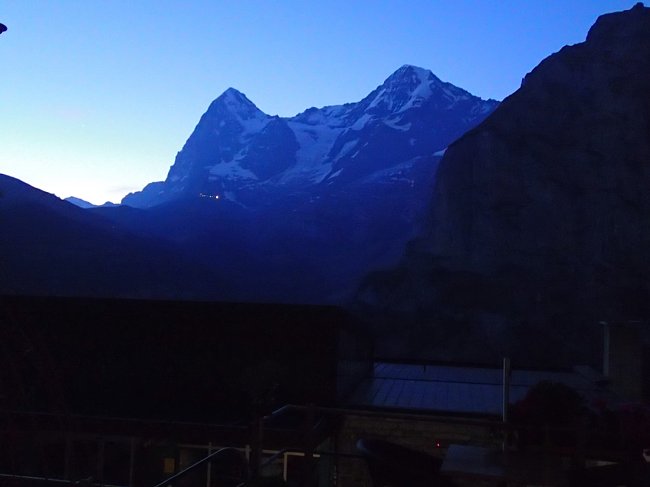 5:50暗い中ホテルを出発してミューレン駅へ、アイガーグレッチャー駅に灯りが見える