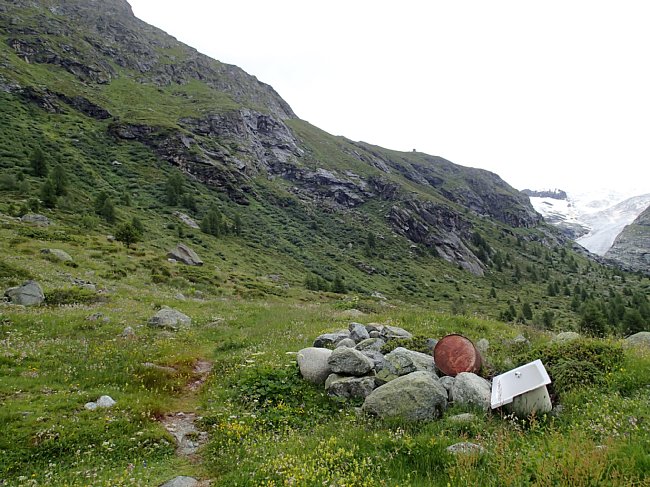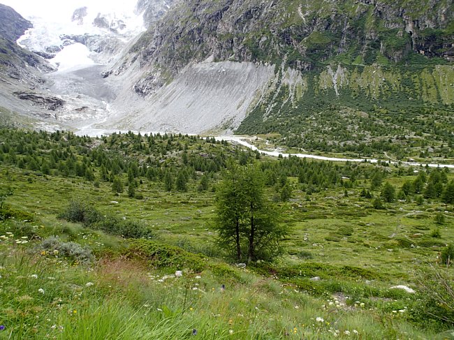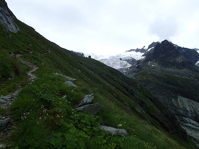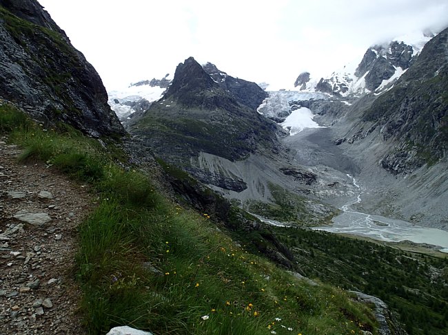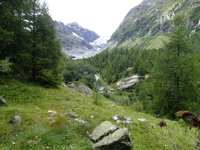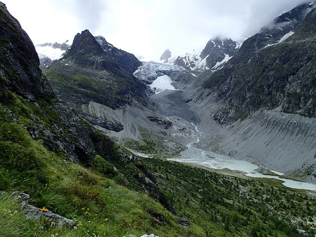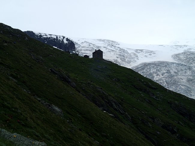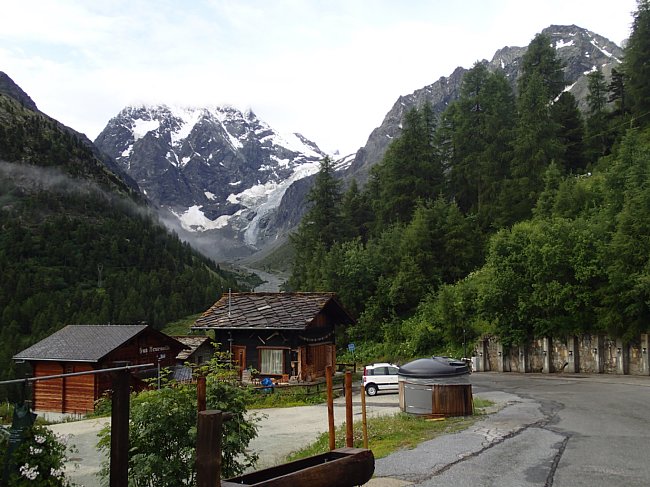 正面にブリコラの小屋とフェルペクル氷河を見上げる