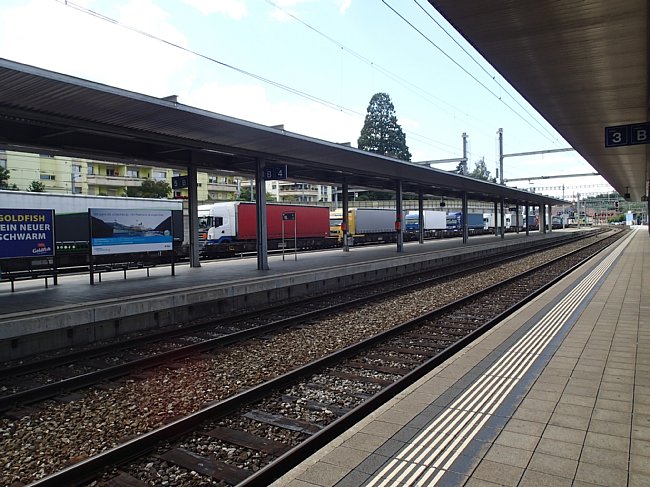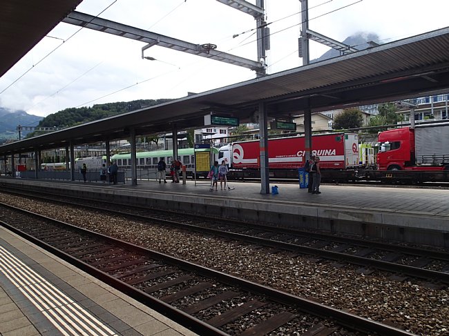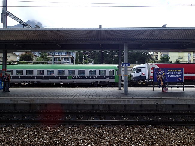 シュピーツ駅、大型トラックを峠越えさせる列車、客車は運転手用か