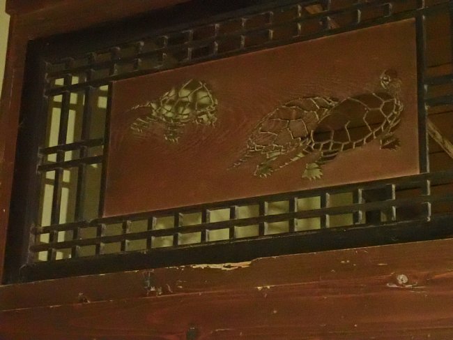 光が差し込むと影絵が浮かび上がる亀の透かし彫り