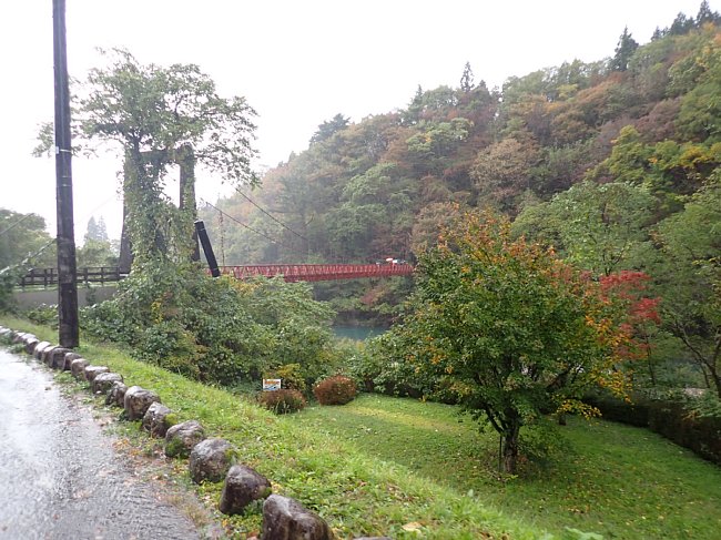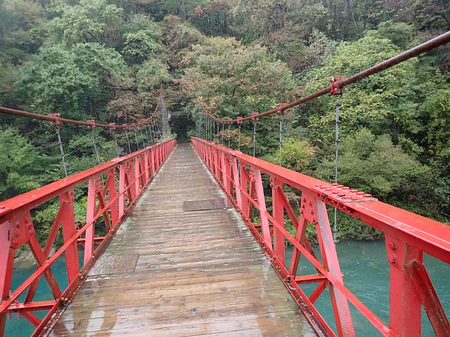 吊橋で玉川を渡る