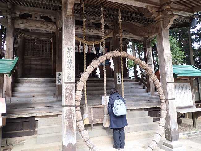 柱の間に茅の輪が取り付けられている白山神社・拝殿