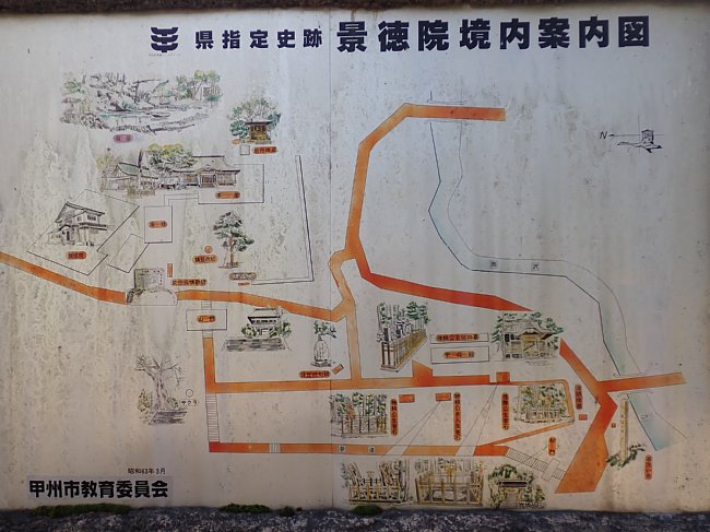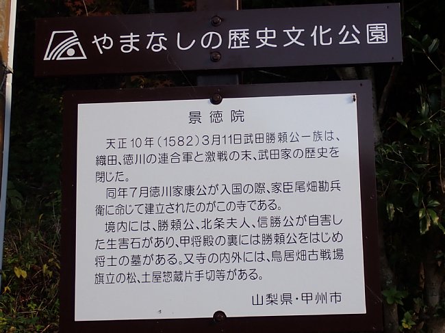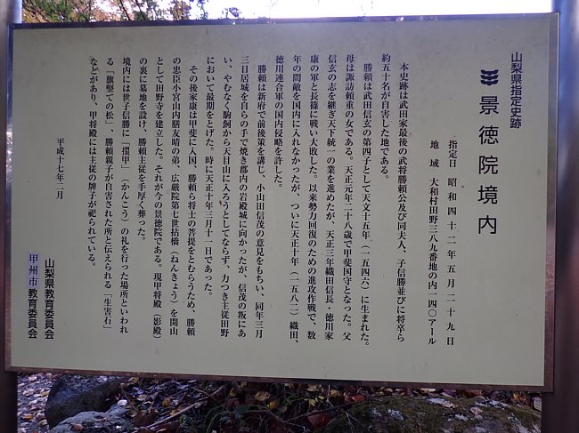 景徳院は武田家終焉の地で境内には武田勝頼公が自刃した生害石やお墓があります。武田一族を滅ぼした徳川家康の命により建立されたと言われています。桜で有名な御寺です。