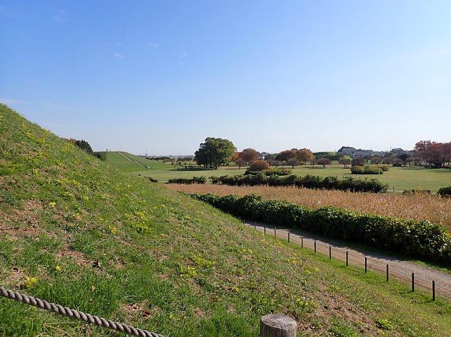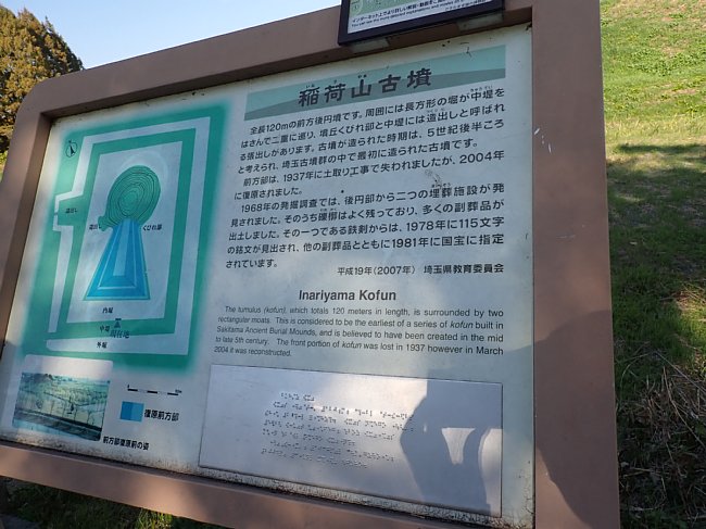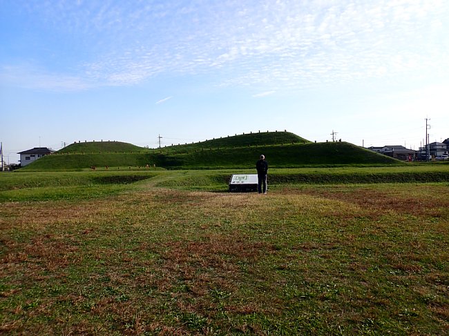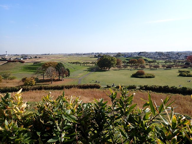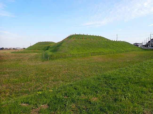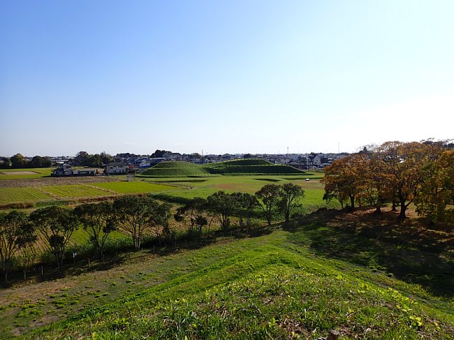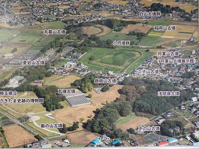 左に前方後円墳の稲荷山古墳、芝生広場の奥に将軍山古墳