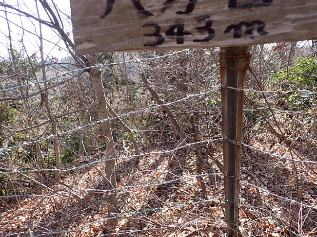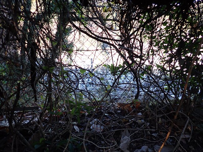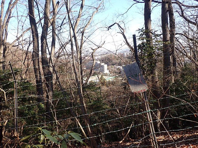 左の拓大側は鉄条網の柵が続く、樹林が濃く拓殖大学の校舎はあまり見えない