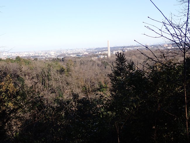 鉄塔から新宿副都心方面の眺め、新宿ビル群の奥にうっすらとスカイツリーが見える